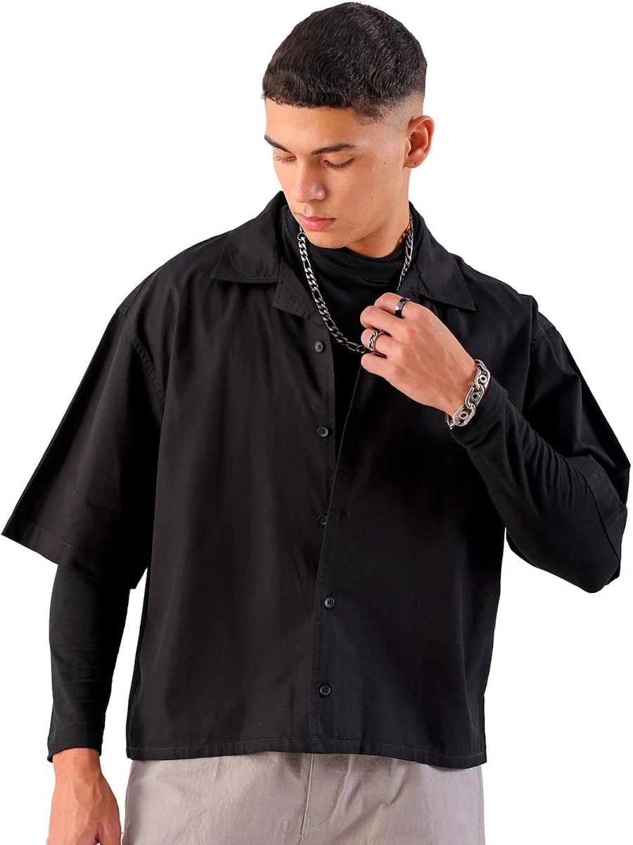 Channel an edgy, street-inspired aesthetic with this Essential Black Oversized Shirt. Featuring a relaxed silhouette and a modern Cuban collar, this piece is the ultimate layering staple for those who prioritize bold, minimalist fashion.
