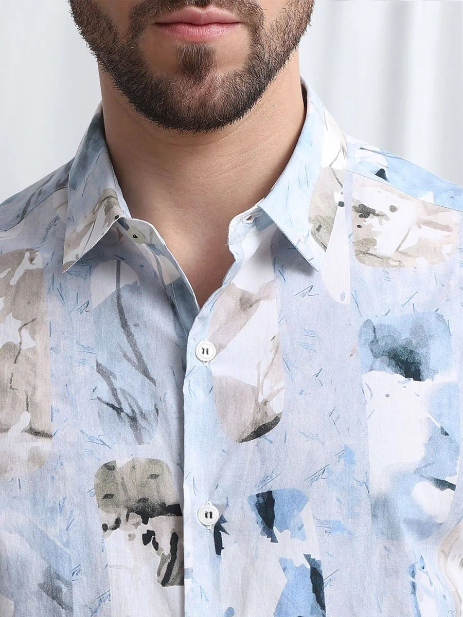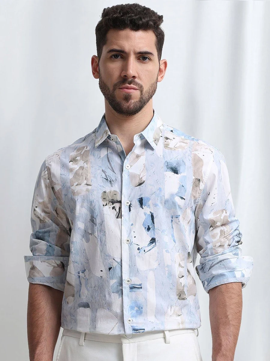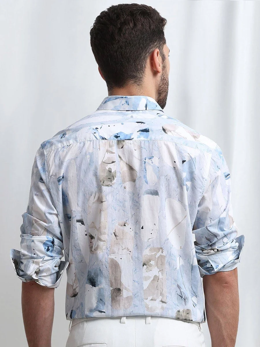 Make a sophisticated statement with this Abstract Watercolor Print Shirt. Featuring a soft palette of blue, grey, and beige, this shirt blends artistic flair with high-end casual fashion, making it a perfect choice for summer events and brunch dates.