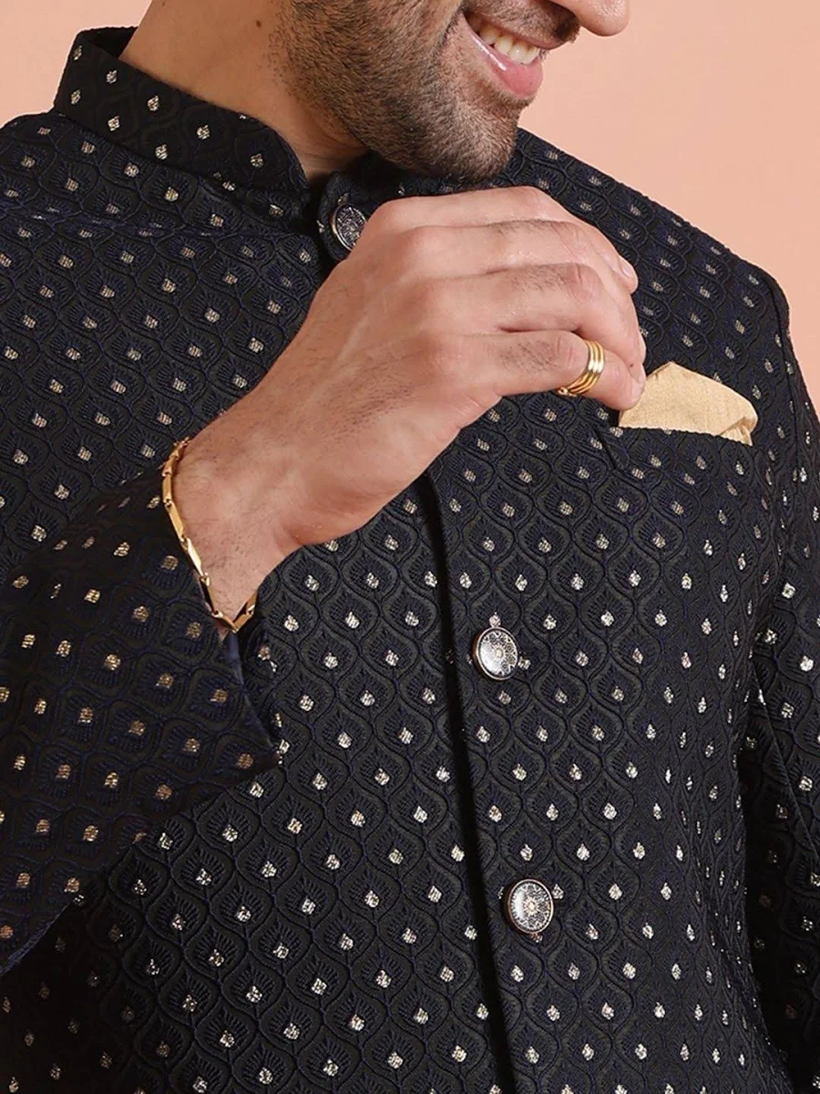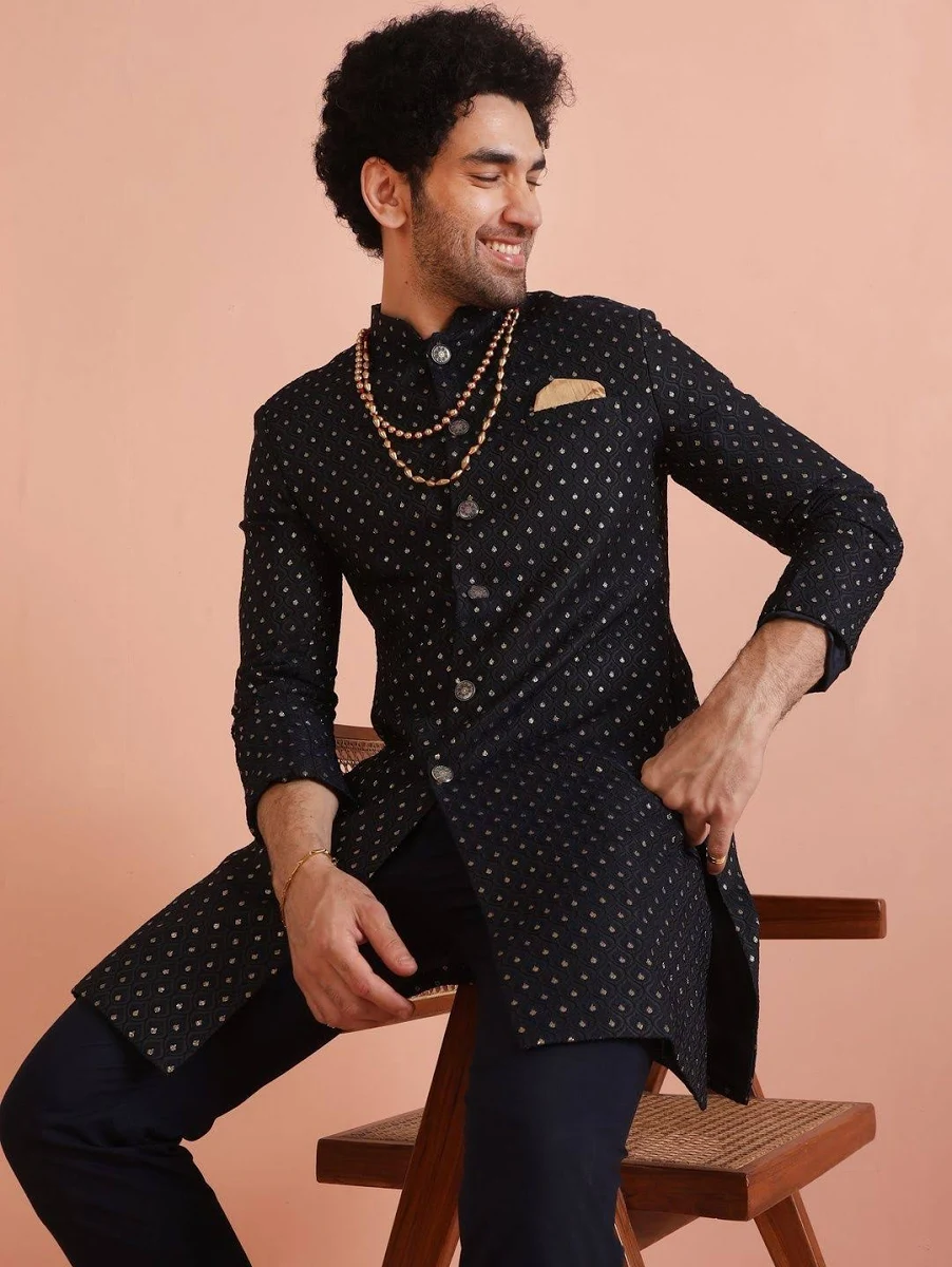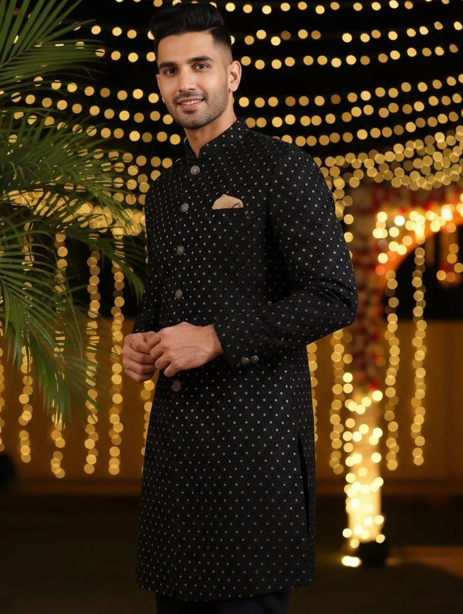 Exude timeless elegance at your next celebration with this Stunning Black Embellished Achkan. Featuring a subtle yet intricate all-over geometric pattern, this garment perfectly balances classic ethnic silhouettes with modern luxury.