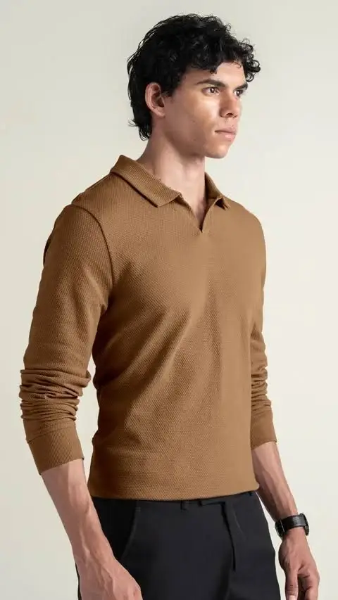 A modern, sophisticated polo featuring a unique waffle-knit texture and a relaxed open collar (buttonless).